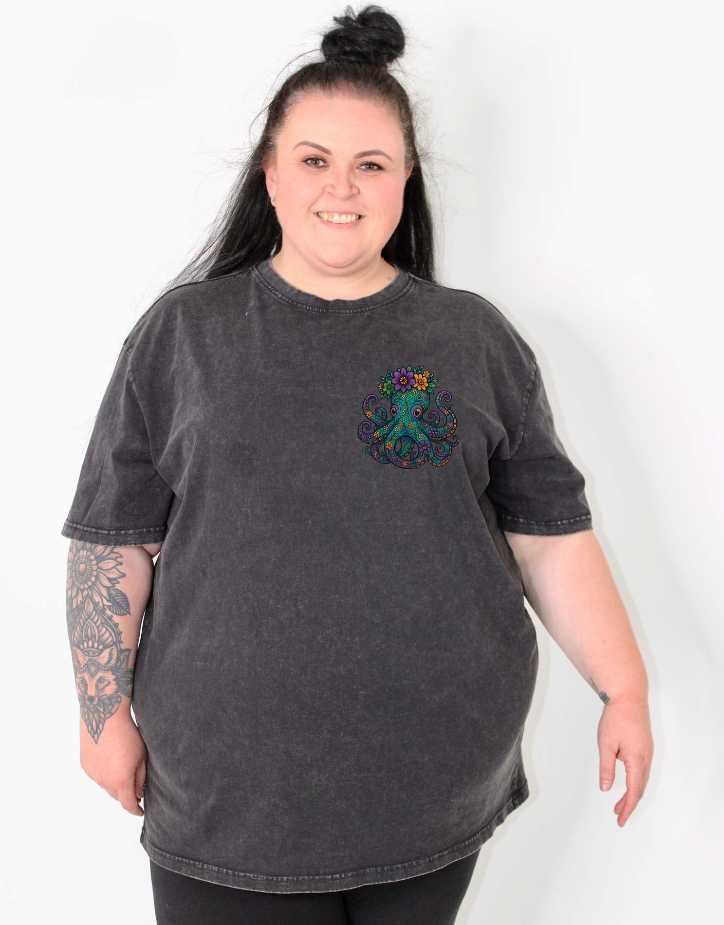 Black Floral Octopus F&B Acid Wash T-Shirt