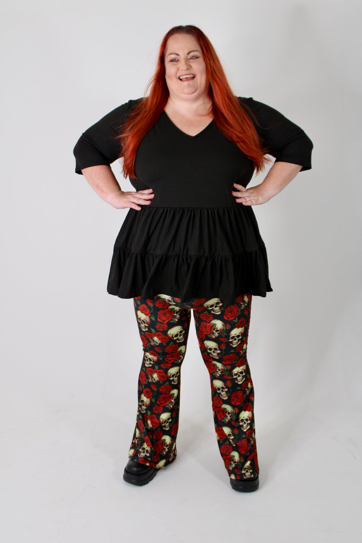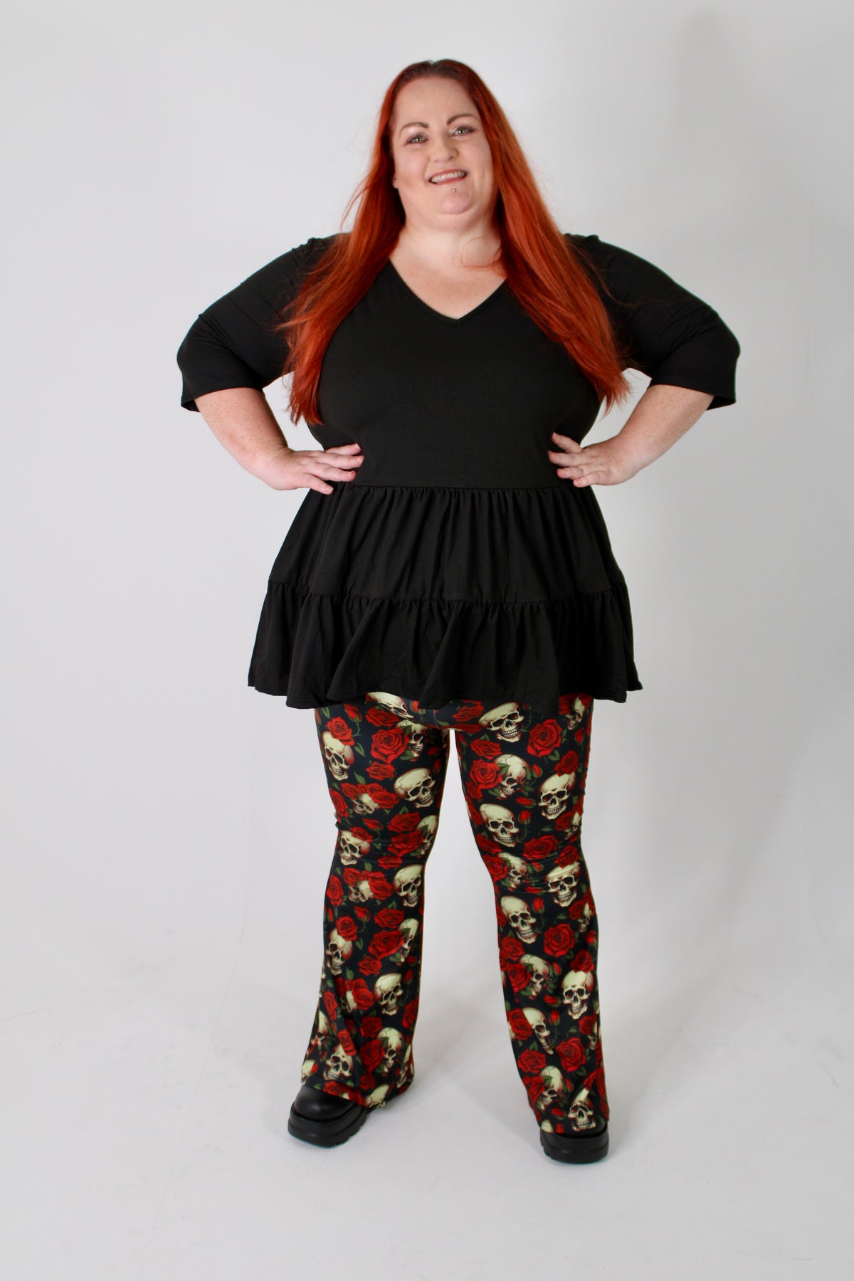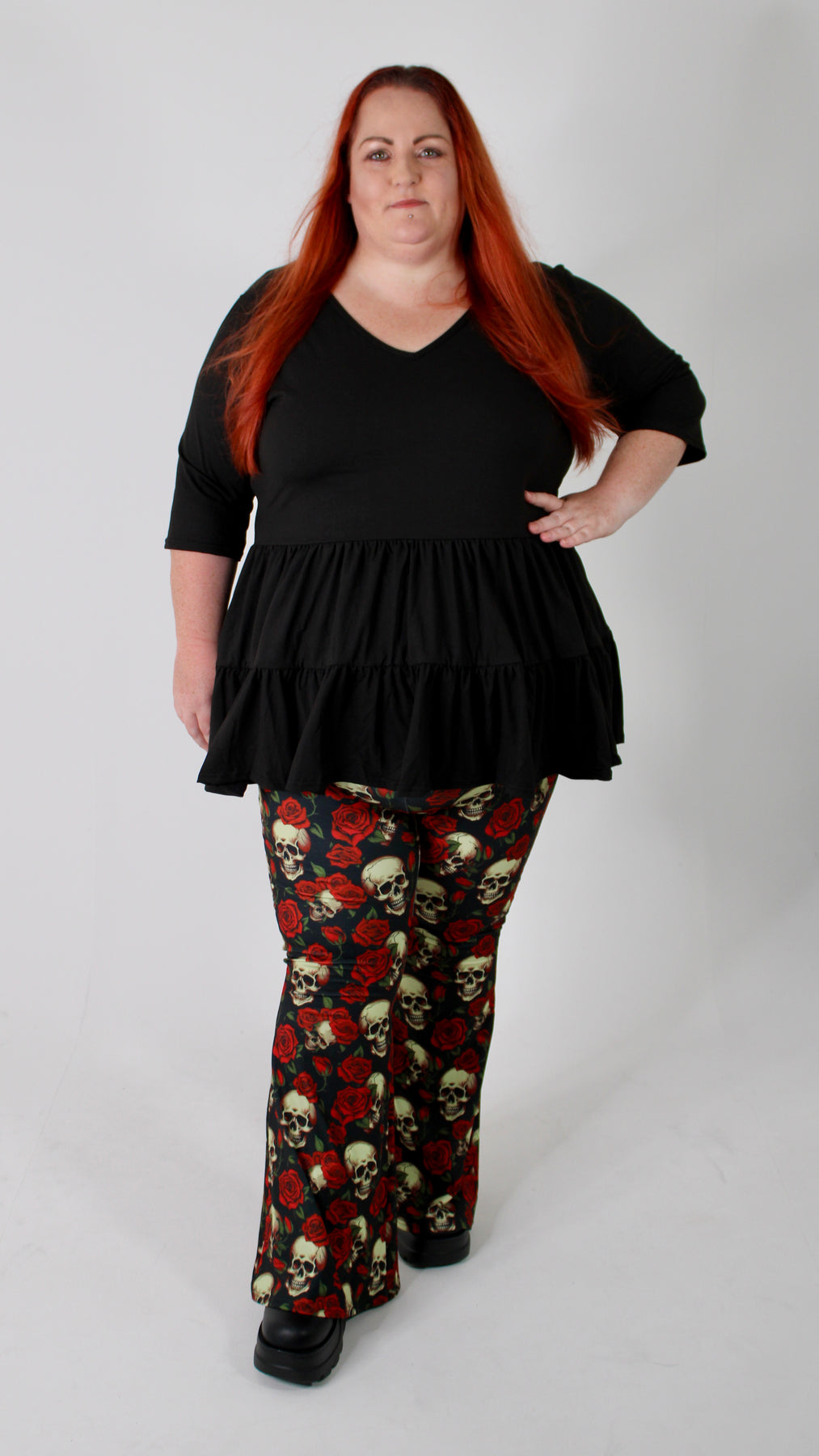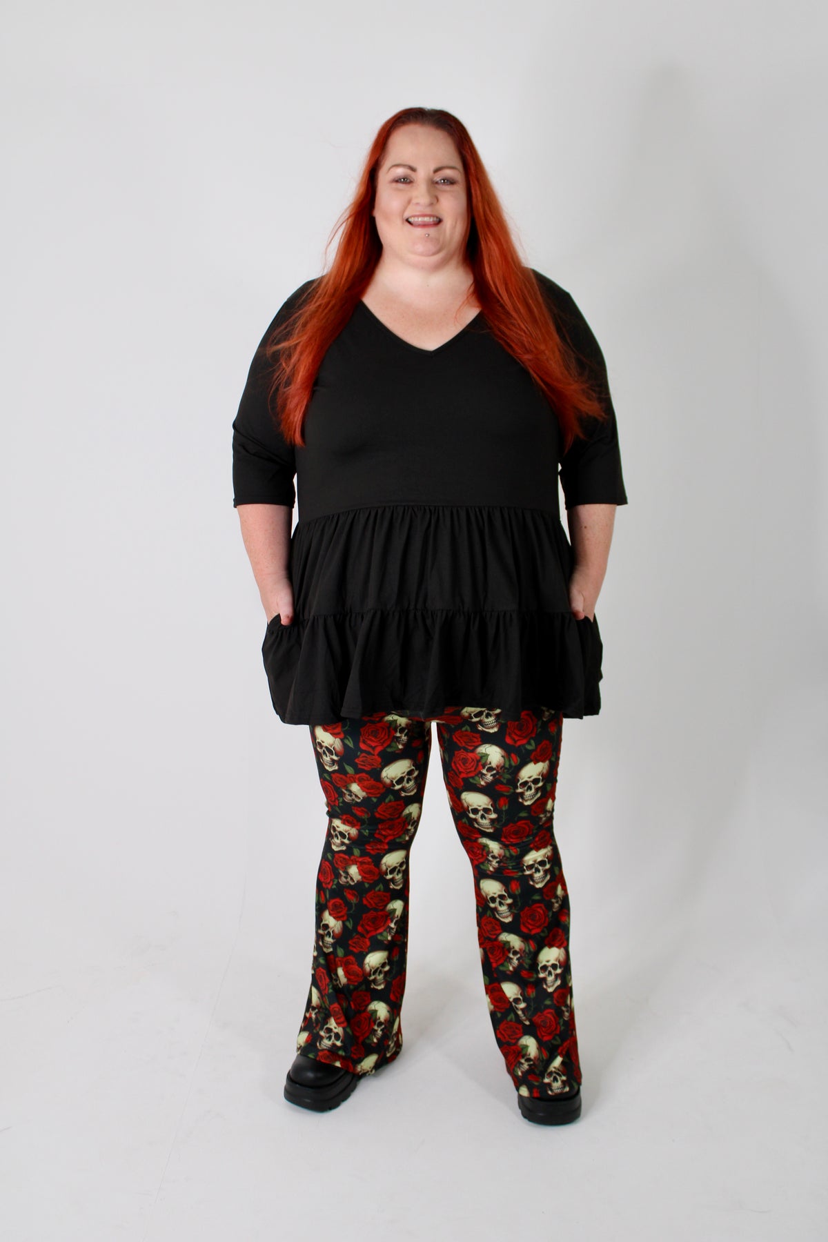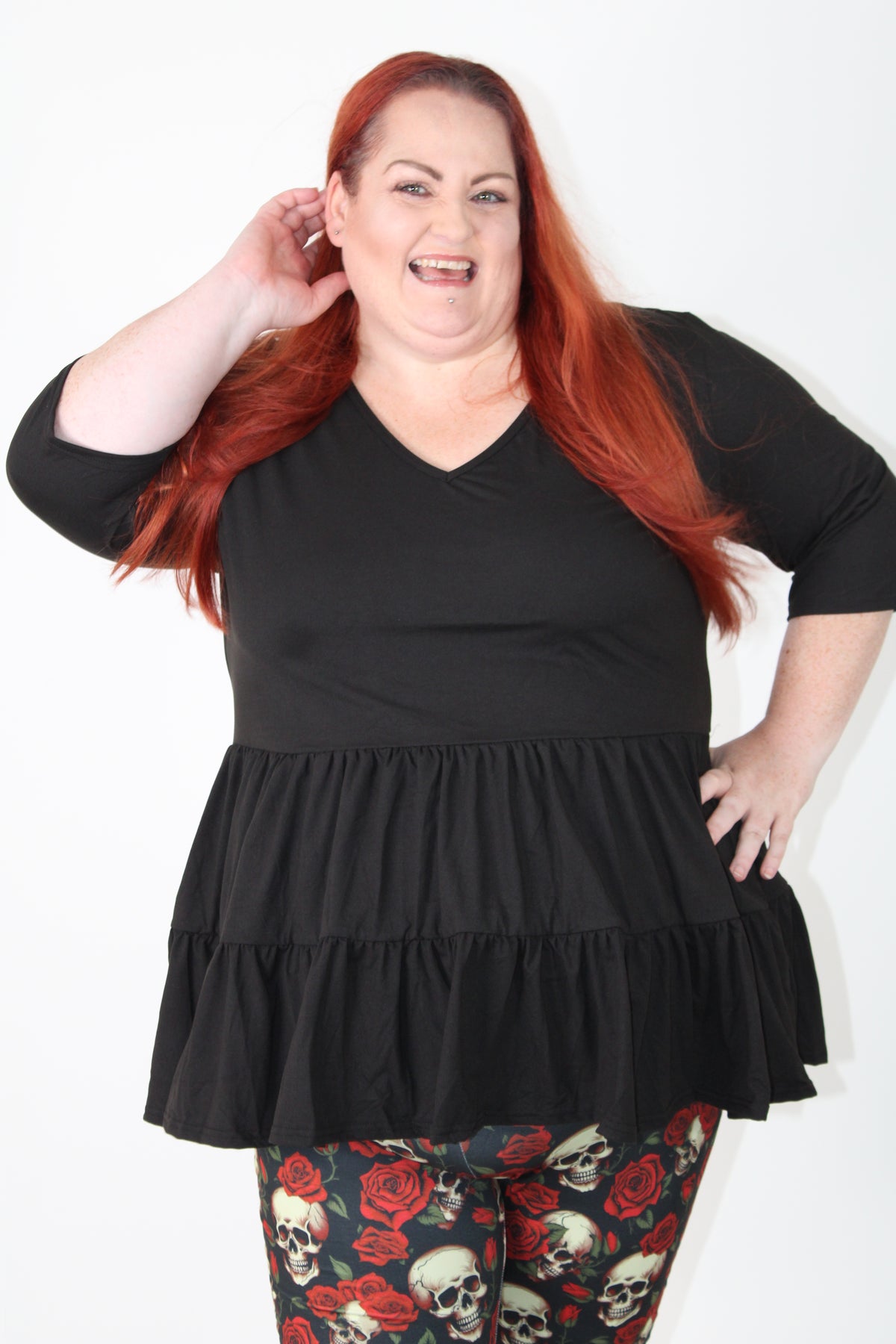 Slip into our new V Neck Tiered Hem Top for a perfect mix of comfort and edge. Its double-brushed fabric feels silky-soft, while moisture-wicking and 360-degree stretch keep you comfy all day. The sharp digitally printed design shines, and careful hand stitching adds a touch of quality. With a flattering V neck, 3/4 sleeves, handy pockets, and a playful tiered hem, this top is your go-to for effortlessly cool vibes.