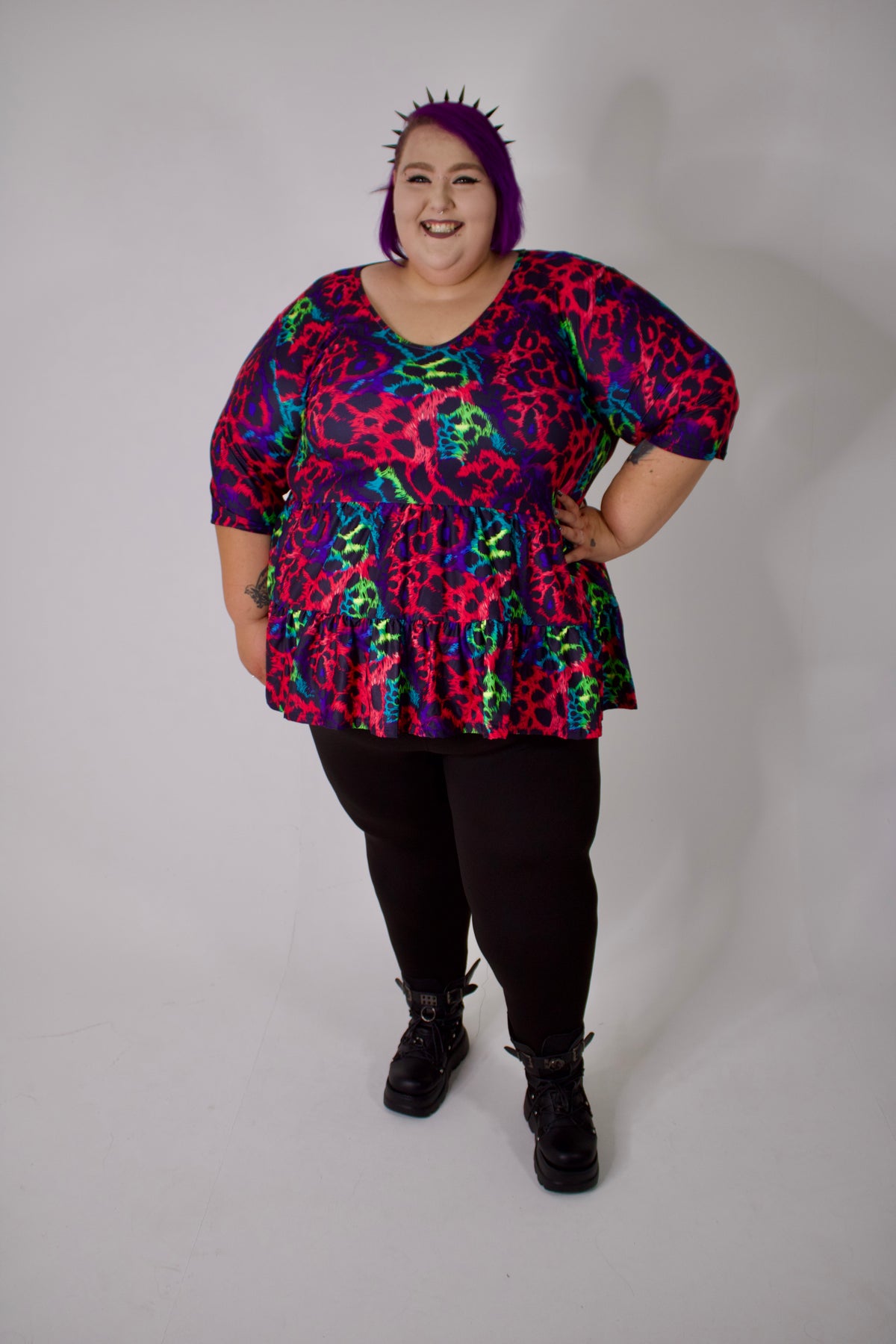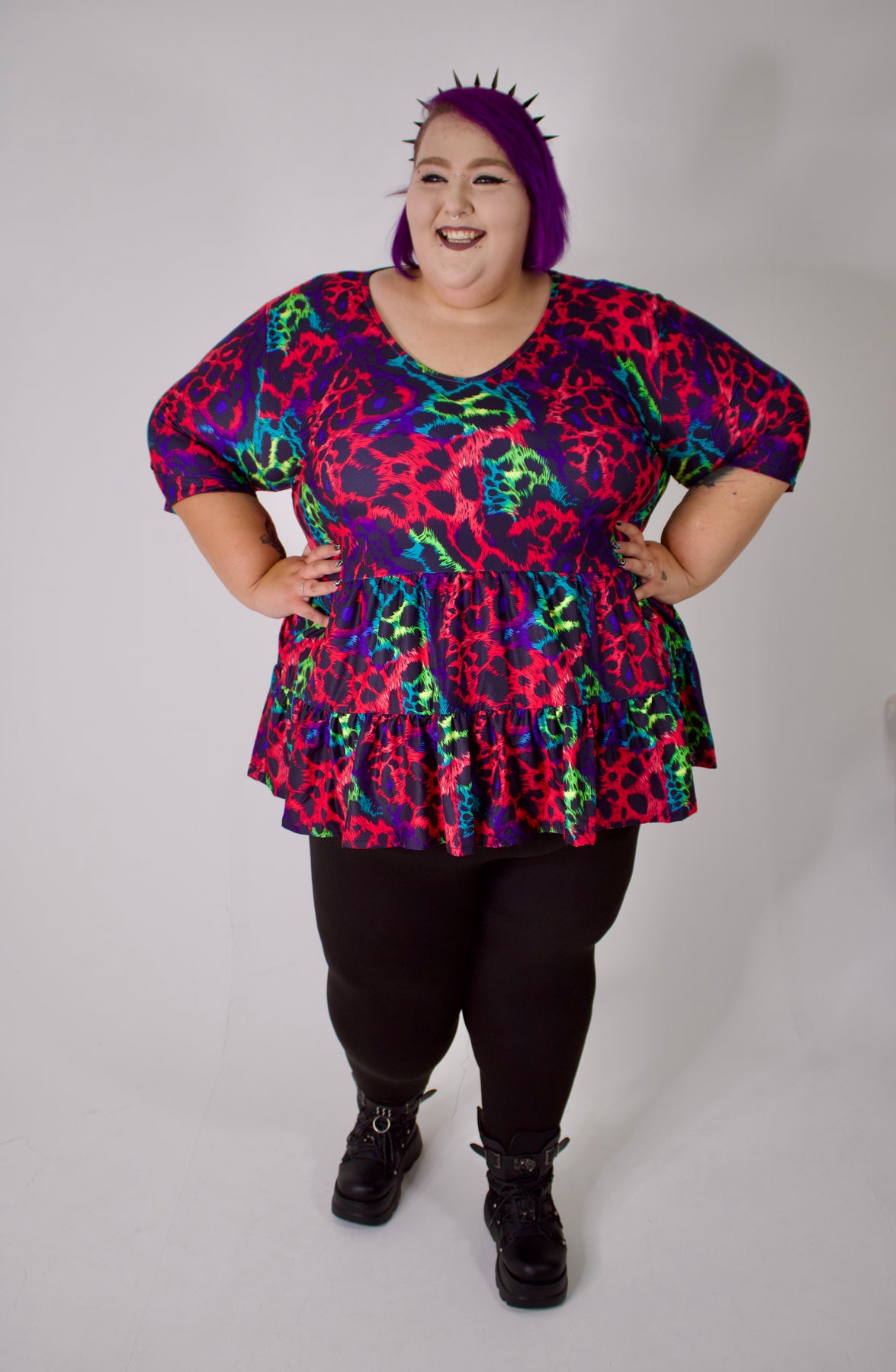 Slip into our new V Neck Tiered Hem Top for a perfect mix of comfort and edge. Its double-brushed fabric feels silky-soft, while moisture-wicking and 360-degree stretch keep you comfy all day. The sharp digitally printed design shines, and careful hand stitching adds a touch of quality. With a flattering V neck, 3/4 sleeves, handy pockets, and a playful tiered hem, this top is your go-to for effortlessly cool vibes.