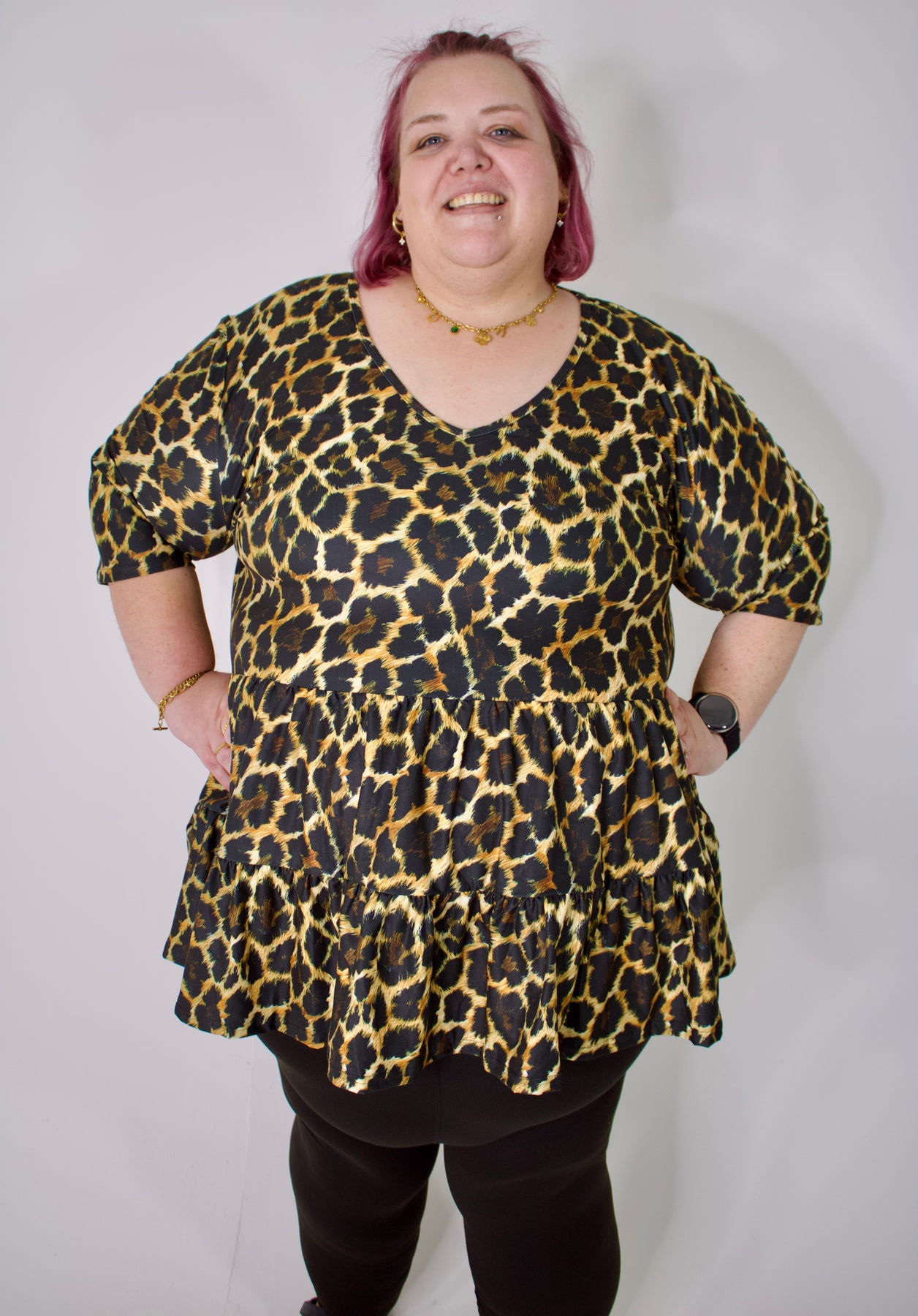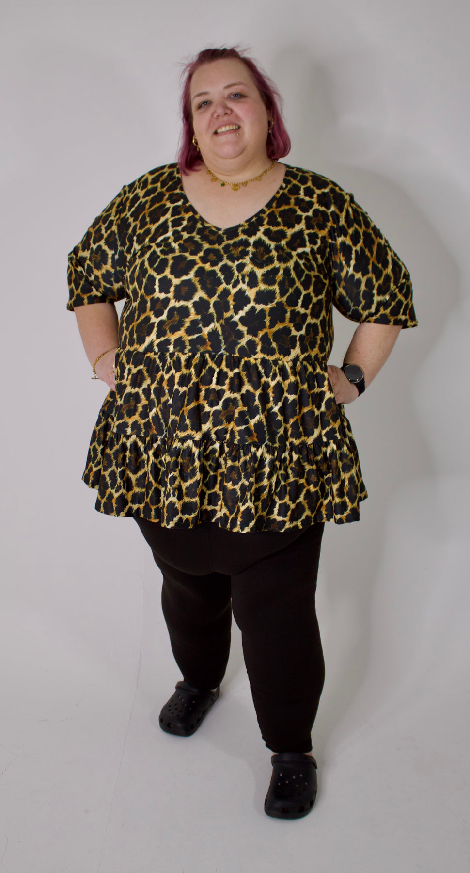 Slip into our new V Neck Tiered Hem Top for a perfect mix of comfort and edge. Its double-brushed fabric feels silky-soft, while moisture-wicking and 360-degree stretch keep you comfy all day. The sharp digitally printed design shines, and careful hand stitching adds a touch of quality. With a flattering V neck, 3/4 sleeves, handy pockets, and a playful tiered hem, this top is your go-to for effortlessly cool vibes.
