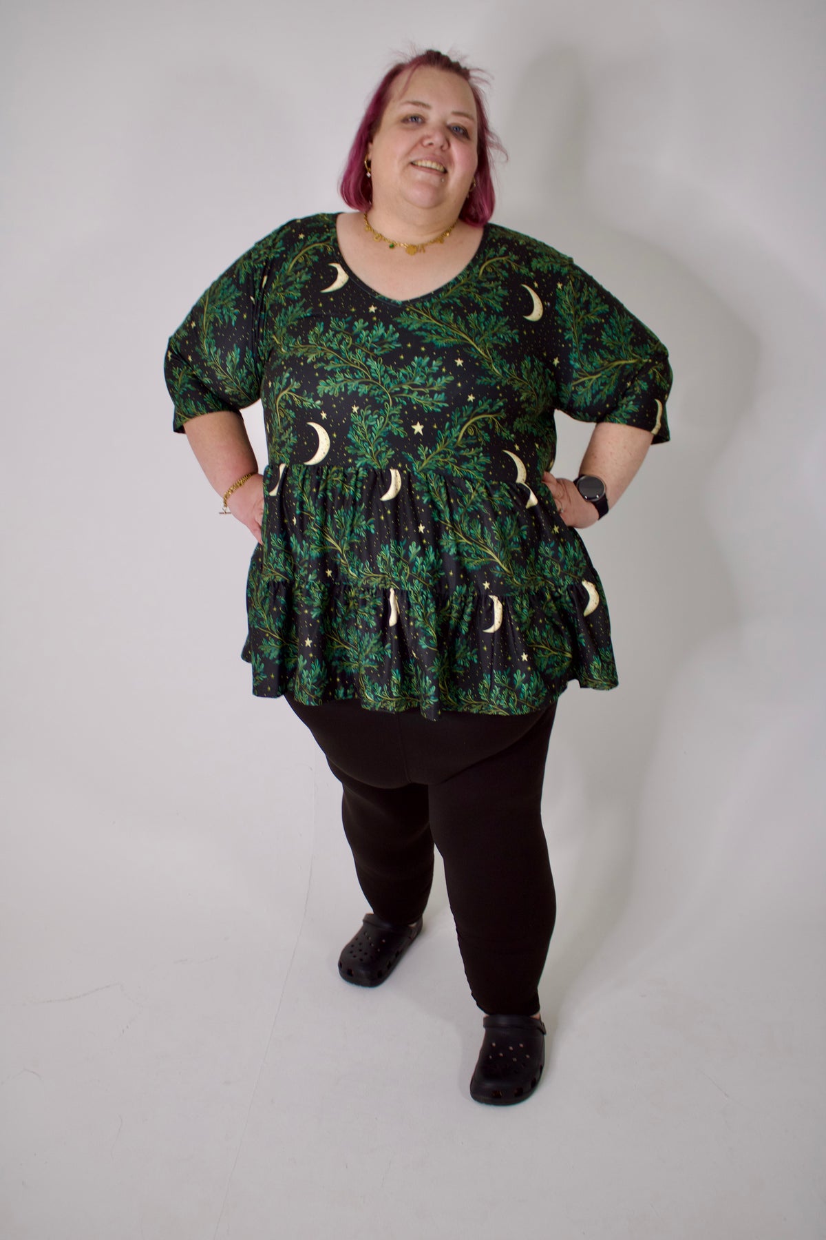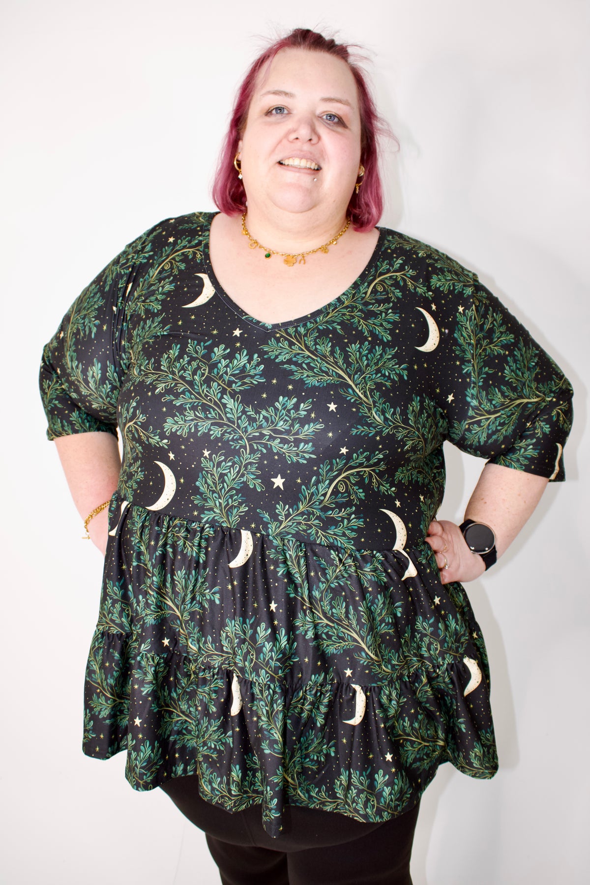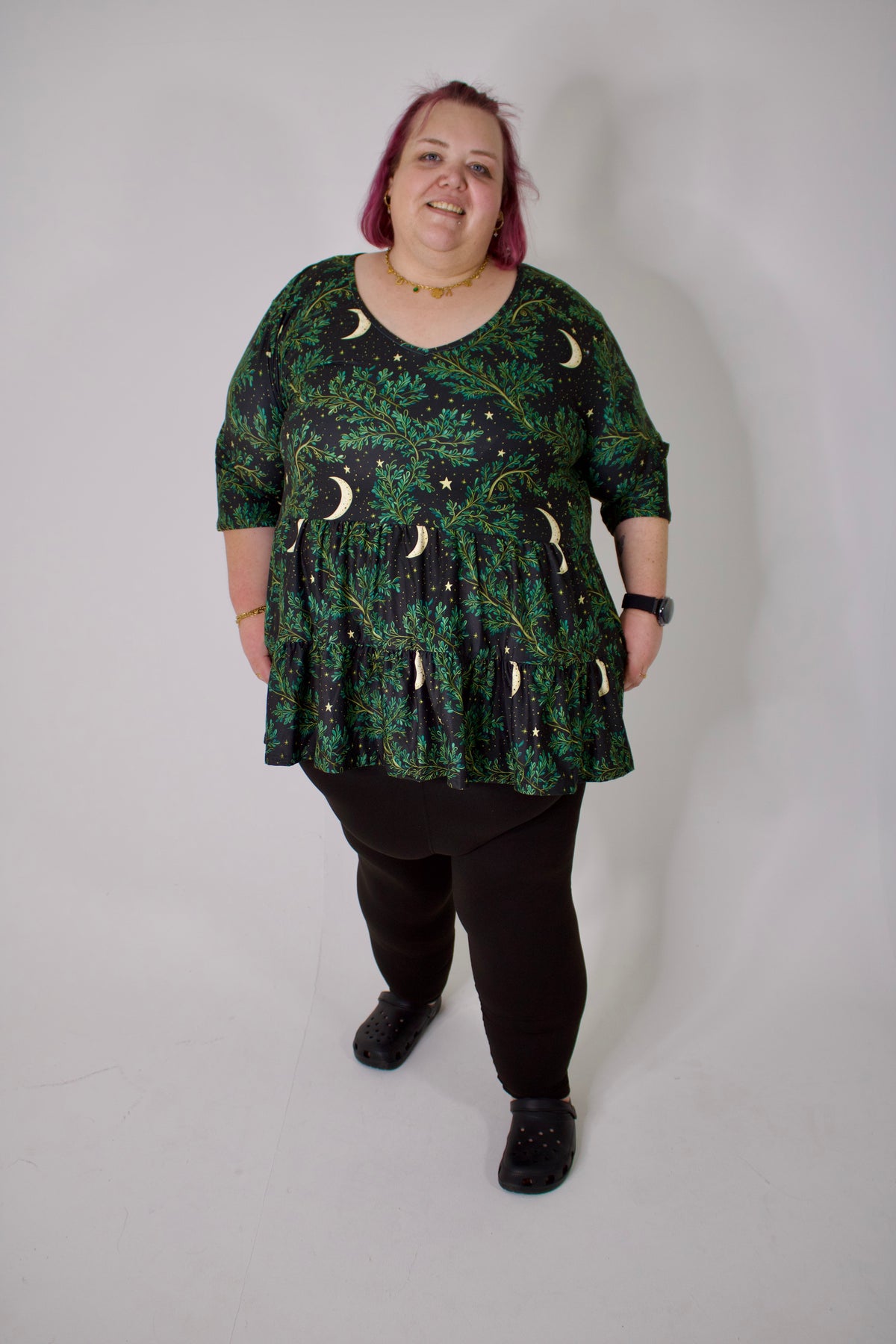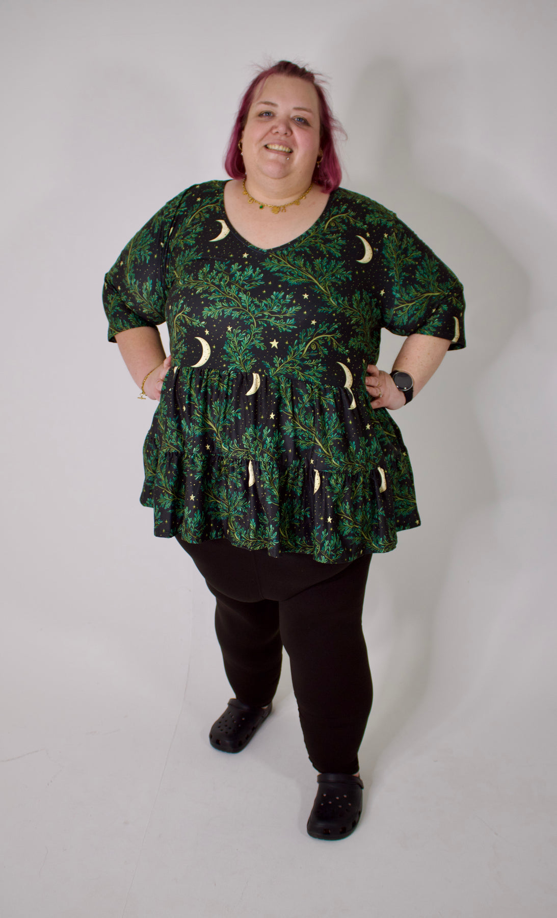 Slip into our new V Neck Tiered Hem Top for a perfect mix of comfort and edge. Its double-brushed fabric feels silky-soft, while moisture-wicking and 360-degree stretch keep you comfy all day. The sharp digitally printed design shines, and careful hand stitching adds a touch of quality. With a flattering V neck, 3/4 sleeves, handy pockets, and a playful tiered hem, this top is your go-to for effortlessly cool vibes.