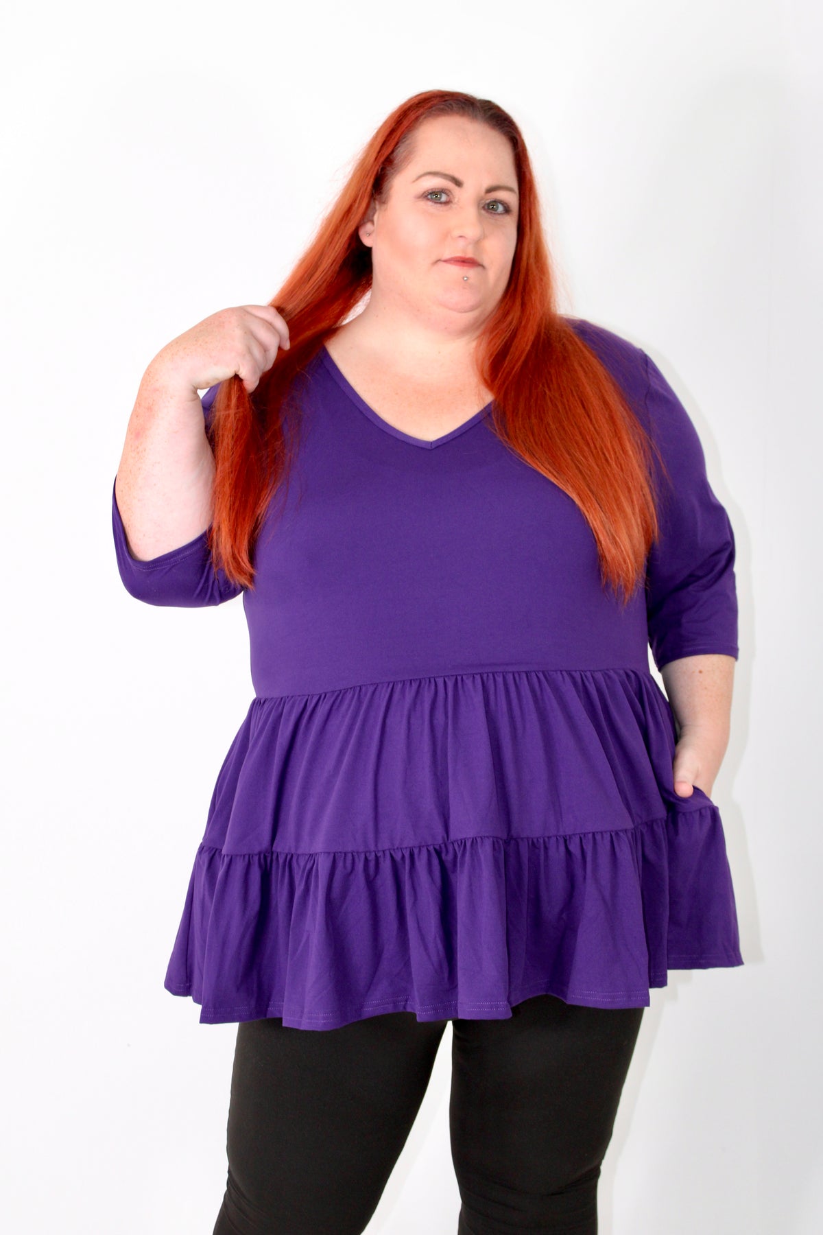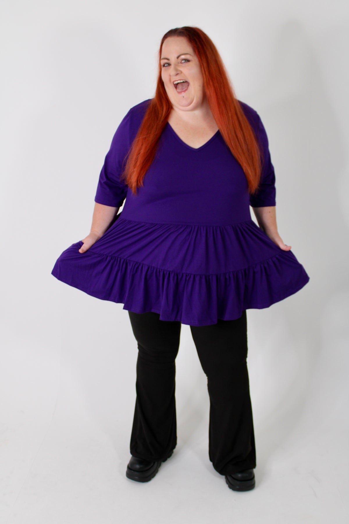 Purple V Neck Tiered Hem Top