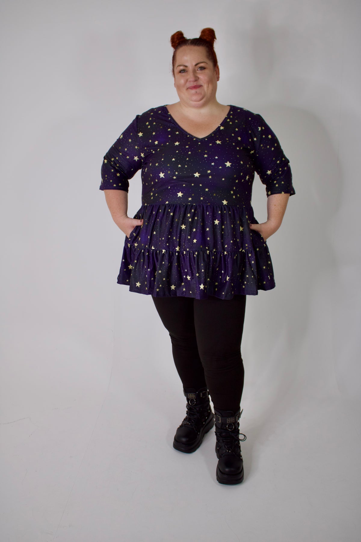 Slip into our new V Neck Tiered Hem Top for a perfect mix of comfort and edge. Its double-brushed fabric feels silky-soft, while moisture-wicking and 360-degree stretch keep you comfy all day. The sharp digitally printed design shines, and careful hand stitching adds a touch of quality. With a flattering V neck, 3/4 sleeves, handy pockets, and a playful tiered hem, this top is your go-to for effortlessly cool vibes.