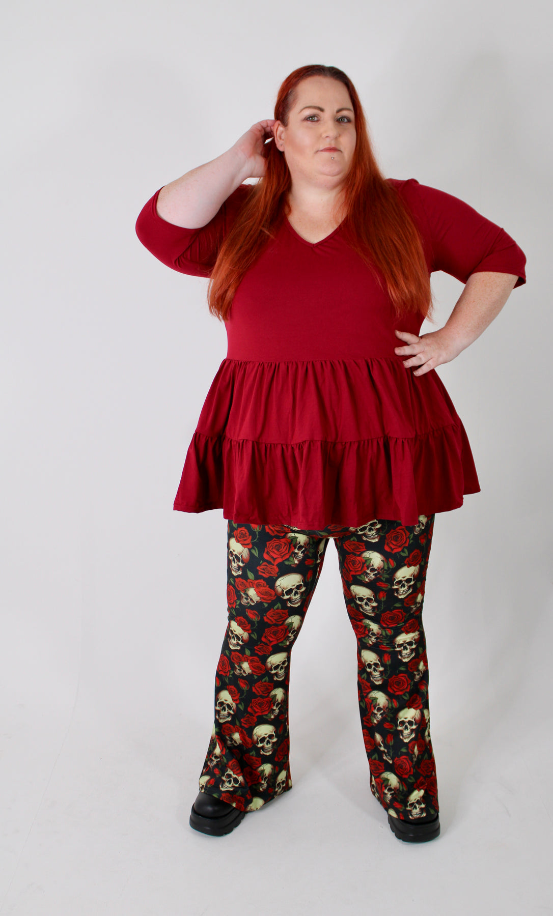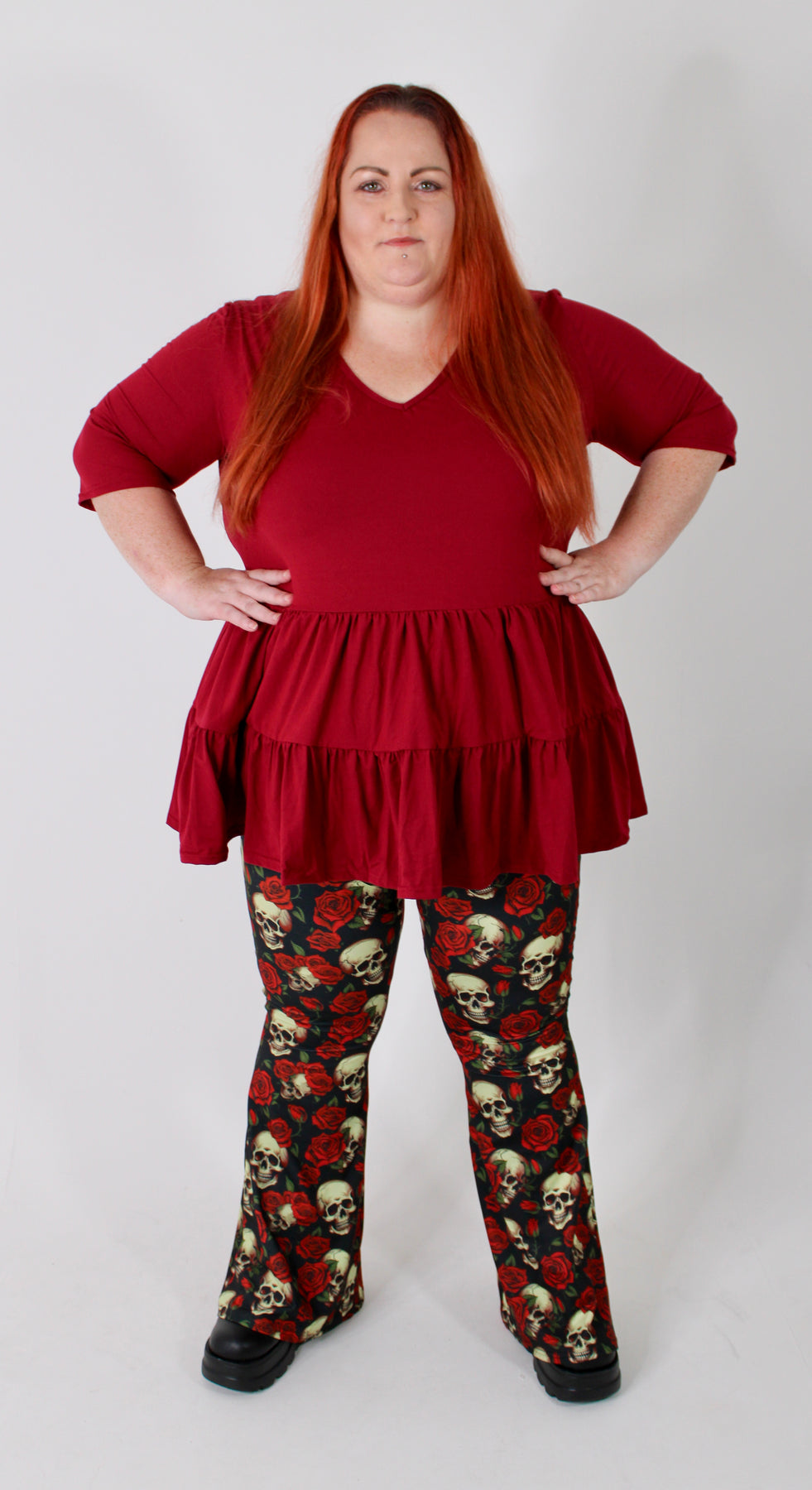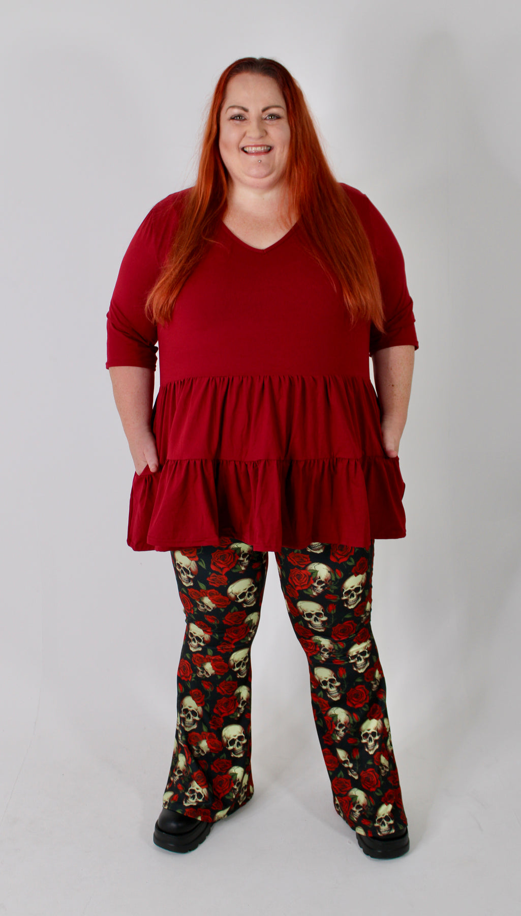 Slip into our new V Neck Tiered Hem Top for a perfect mix of comfort and edge. Its double-brushed fabric feels silky-soft, while moisture-wicking and 360-degree stretch keep you comfy all day. The sharp digitally printed design shines, and careful hand stitching adds a touch of quality. With a flattering V neck, 3/4 sleeves, handy pockets, and a playful tiered hem, this top is your go-to for effortlessly cool vibes.